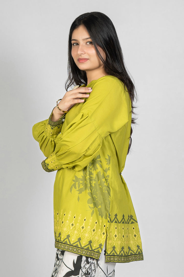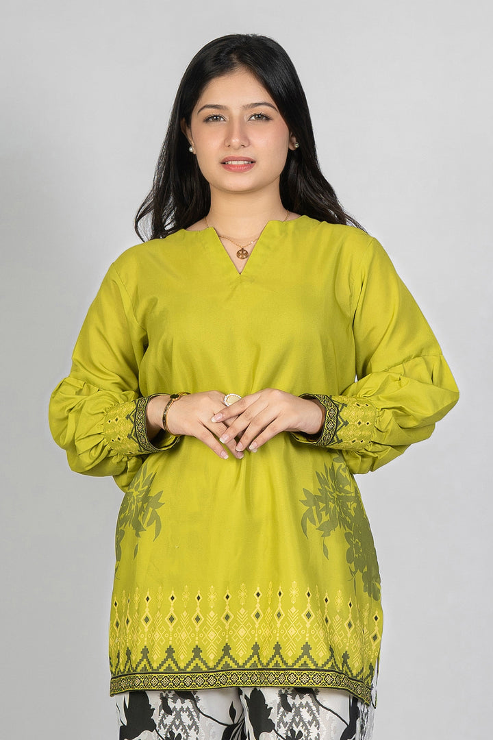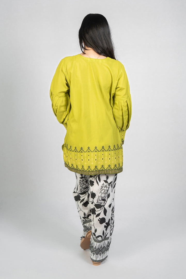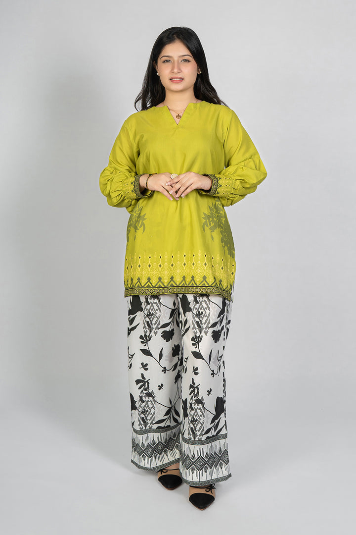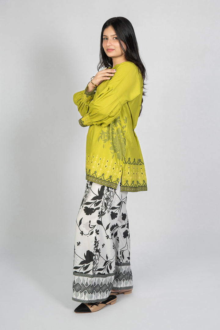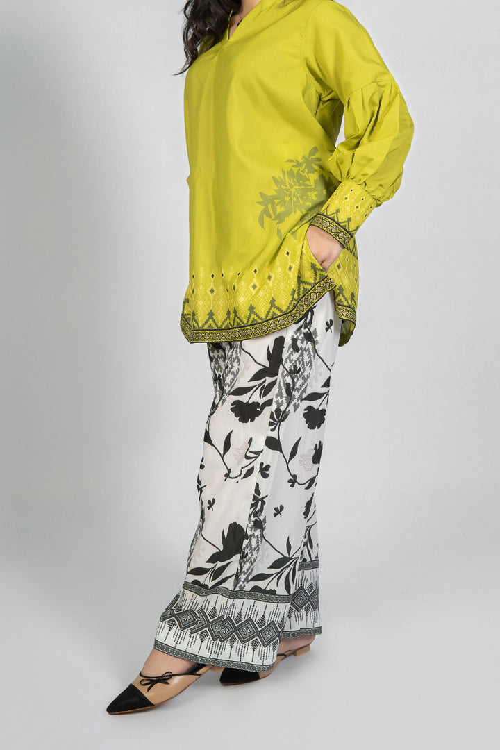 Lureen β Fresh and elegant, Lureen features a soft green shirt with stylish gathered sleeves that bring a touch of charm to your look. It is paired with wide-leg white pants, printed with bold black floral designs. This co-ord set is perfect for the woman who loves calm colors and effortless style. ππ€