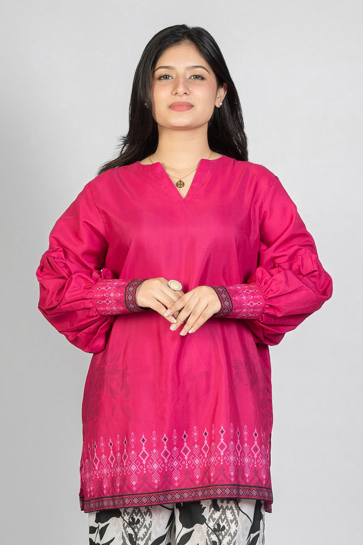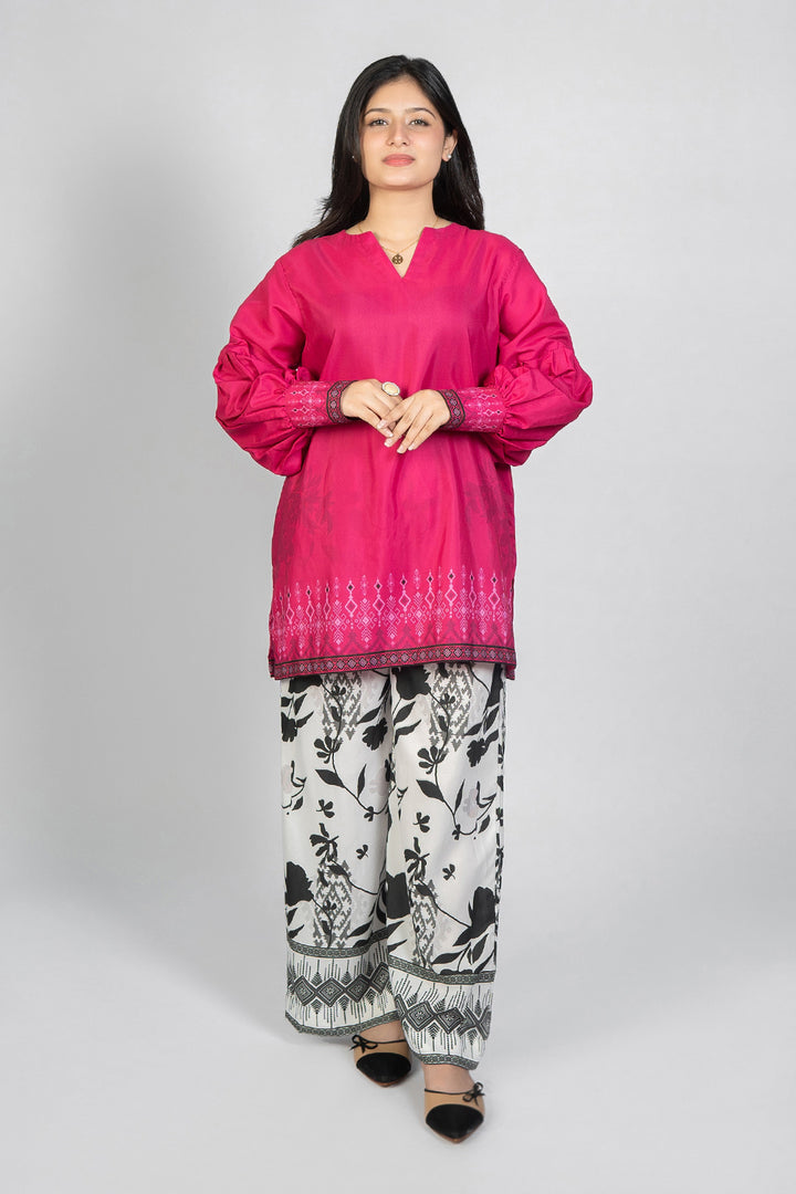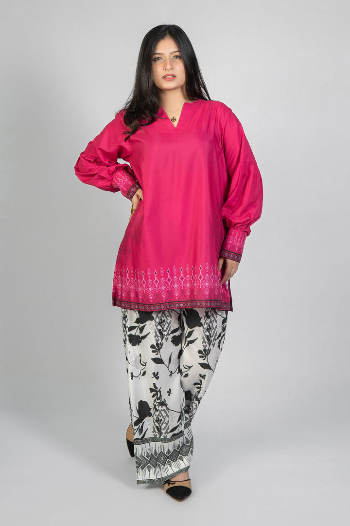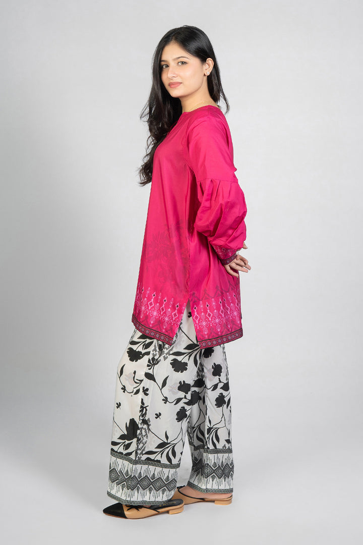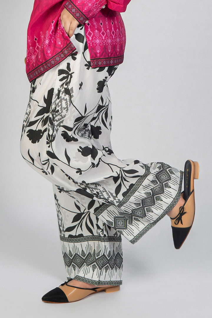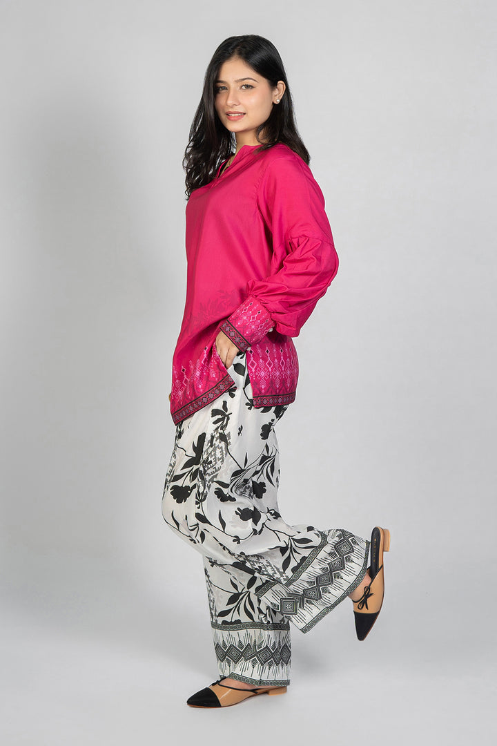 Zyrah β Bold and beautiful, Zyrah features a deep magenta pink shirt with gathered sleeves that add a touch of elegance and style. It is paired with wide-leg white pants, decorated with bold black floral prints. This co-ord set is perfect for the woman who loves to stand out with grace and confidence. ππ€